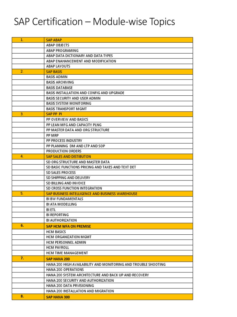 The document outlines 29 different SAP modules and topics that can be covered in SAP certification. It provides a breakdown of key sub-topics within each module, including ABAP, SAP Basis, PP/PI, SD, BI/BW, HCM, HANA, FI, Controlling, MM, WM, Ariba, SuccessFactors, APO, PI, BPC, Hybris, SRM, CRM, Fiori, Security, PLM, Hybris CRM, and UK Payroll. The certifications cover important areas like procurement, inventory, production, sales, finance, human resources, analytics, and more.