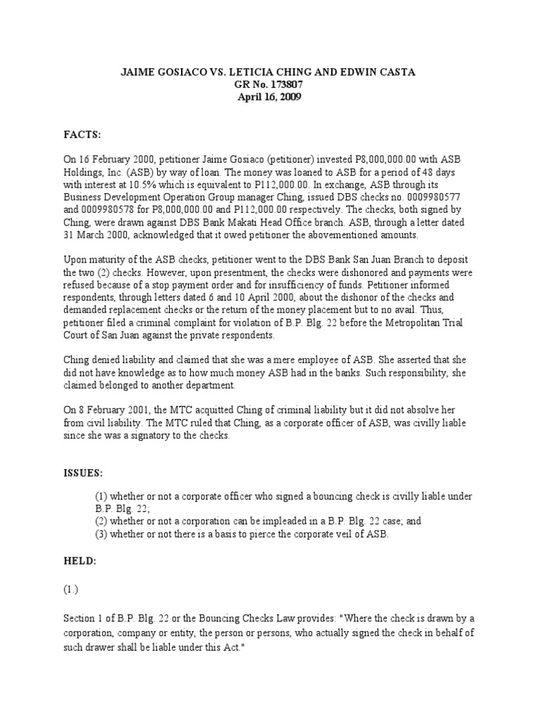 On 16 February 2000, petitioner Jaime Gosiaco (petitioner) invested P8,000,000.00 with ASB