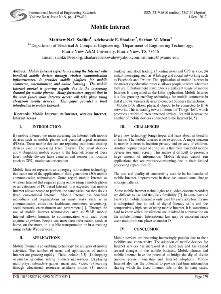 iii. R. Staton, The mobile Internet: What is it? How Matthew N.O. Sadiku is a professor at Prairie View A&M
