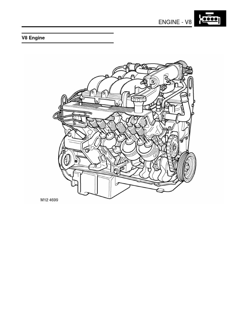 The V8 petrol engine is an eight cylinder, water cooled unit having two banks of four cylinders positioned at 90