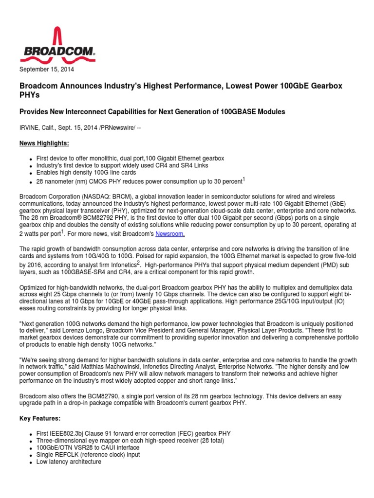 Broadcom Announces Industry's Highest Performance, Lowest Power 100GbE Gearbox