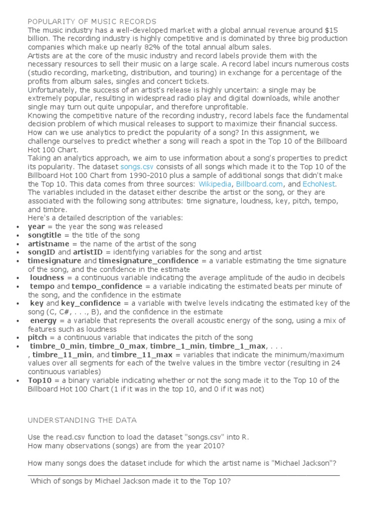 How can we use analytics to predict the popularity of a song? In this assignment, we