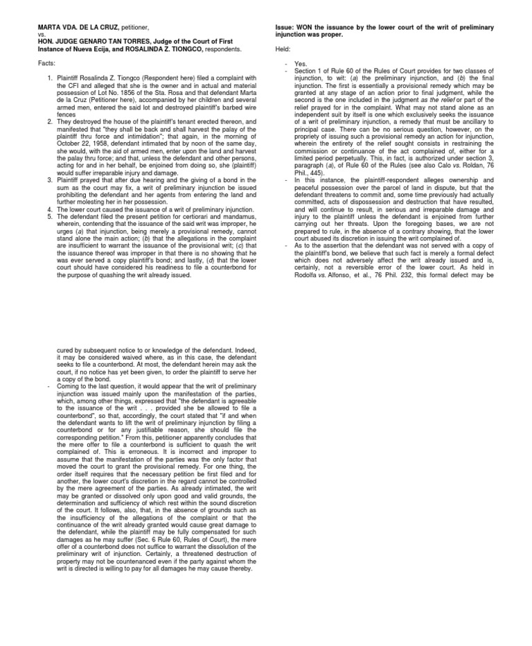 DE LA CRUZ, petitioner, Issue: WON the issuance by the lower court of the writ of preliminary