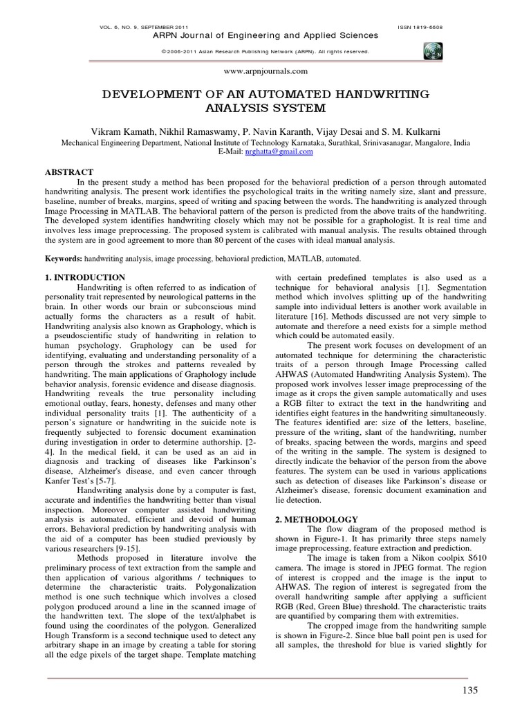 baseline, number of breaks, margins, speed of writing and spacing between the words. The handwriting is analyzed through