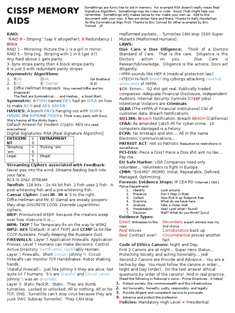 RAID 5 – 5trip1ng. Striping with 1 in it (get it?) Standard of Care. That is the care. Diligence is the