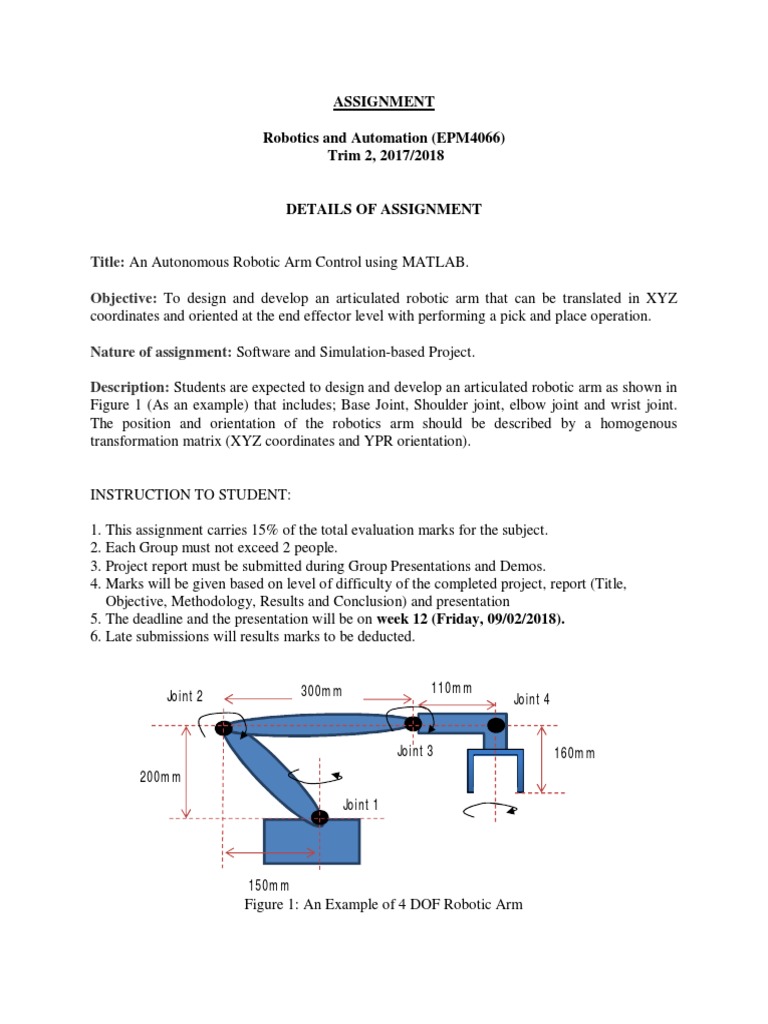 Description: Students are expected to design and develop an articulated robotic arm as shown in
