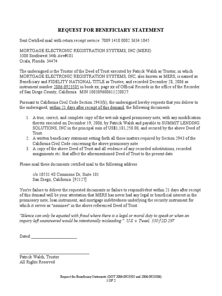 2. A written beneficiary statement setting forth all those matters required by Section 2943 of the
