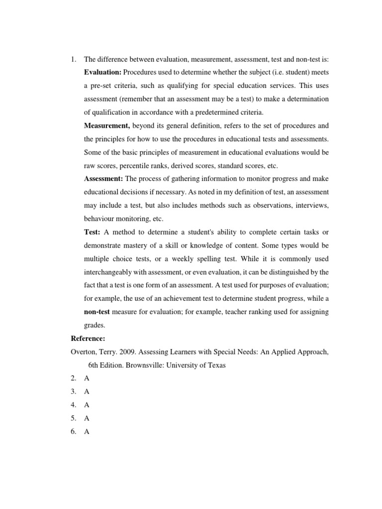 The difference between evaluation, measurement, assessment, test and non-test is: