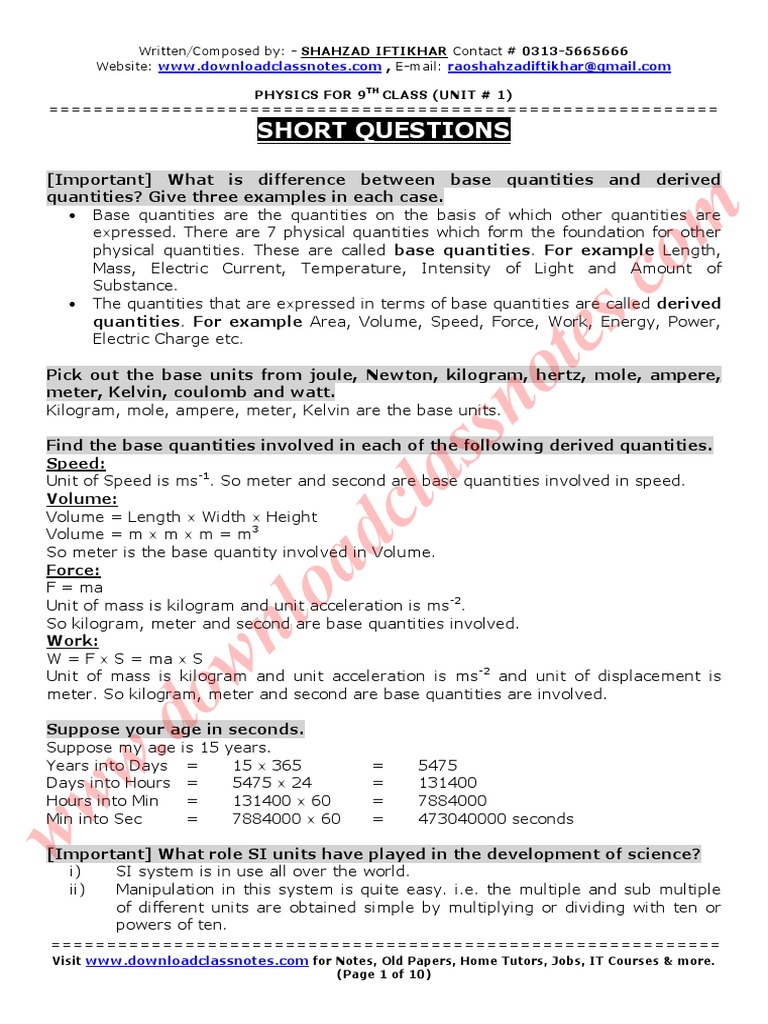 PHYSICS FOR 9TH CLASS (UNIT # 1)