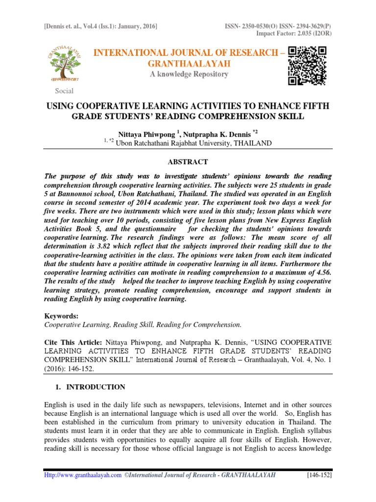 such as the research results for using cooperative learning activities to enhance grade 5 students’