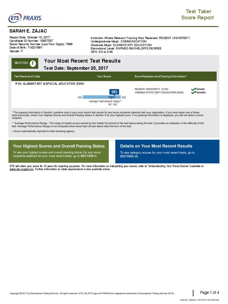 * The passing information in Section I pertains only to your most recent test results for any score recipients selected with your registration. If you have taken one of these