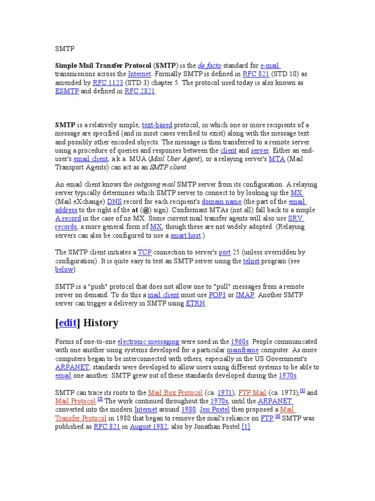 transmissions across the Internet. Formally SMTP is defined in RFC 821 (STD 10) as