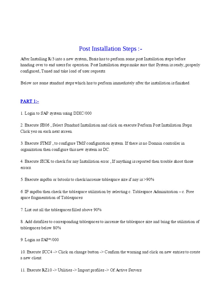 After Installing R/3 into a new system, Basis has to perform some post Installation steps before