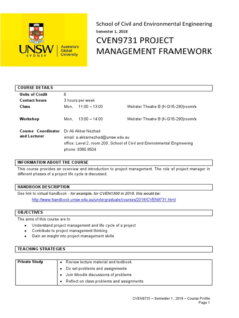 CVEN9731 – Semester 1 , 2018 – Courrse Profile