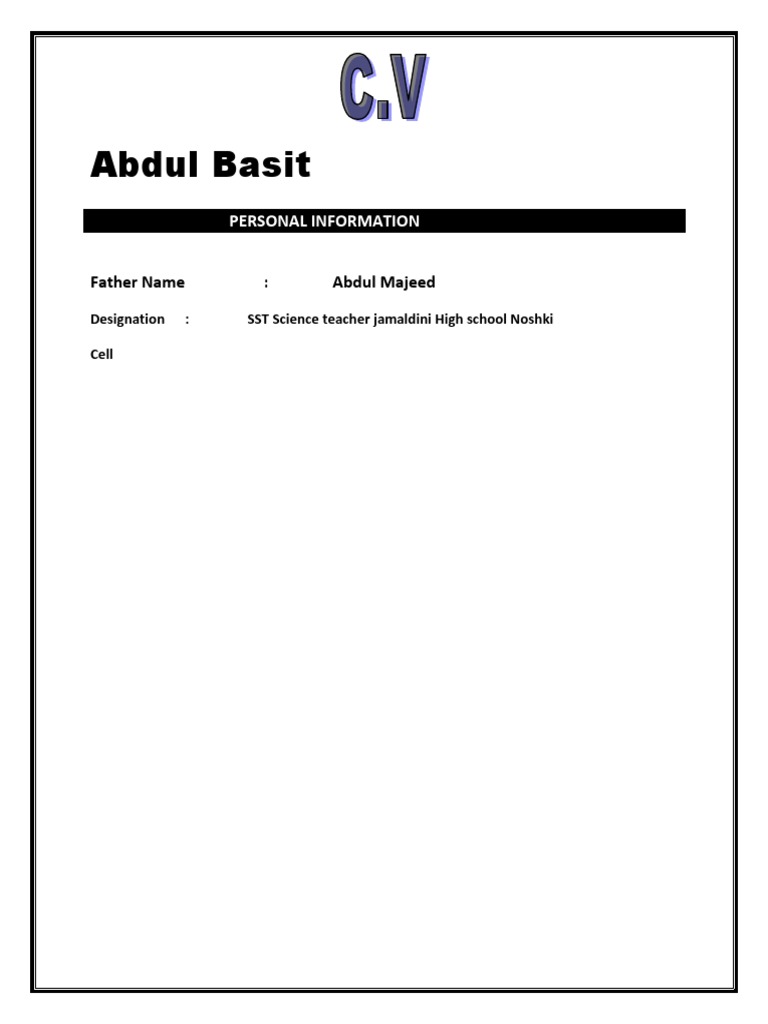 Abdul Basit's father is Abdul Majeed, who works as an SST Science teacher at Jamaldini High School in Noshki. The document provides personal information about Abdul Basit, including his father's name and occupation.
