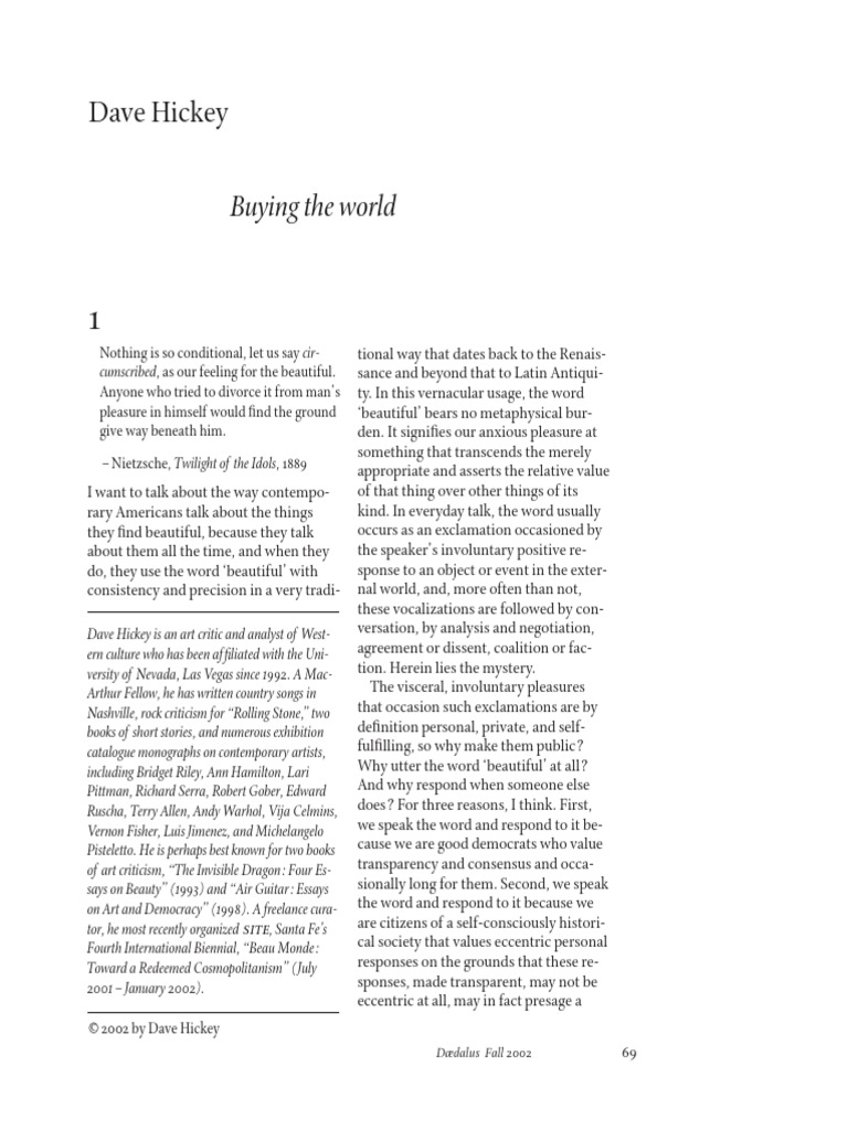 Dave Hickey year tradition of aesthetic discourse ty a powerful category of value in soci-