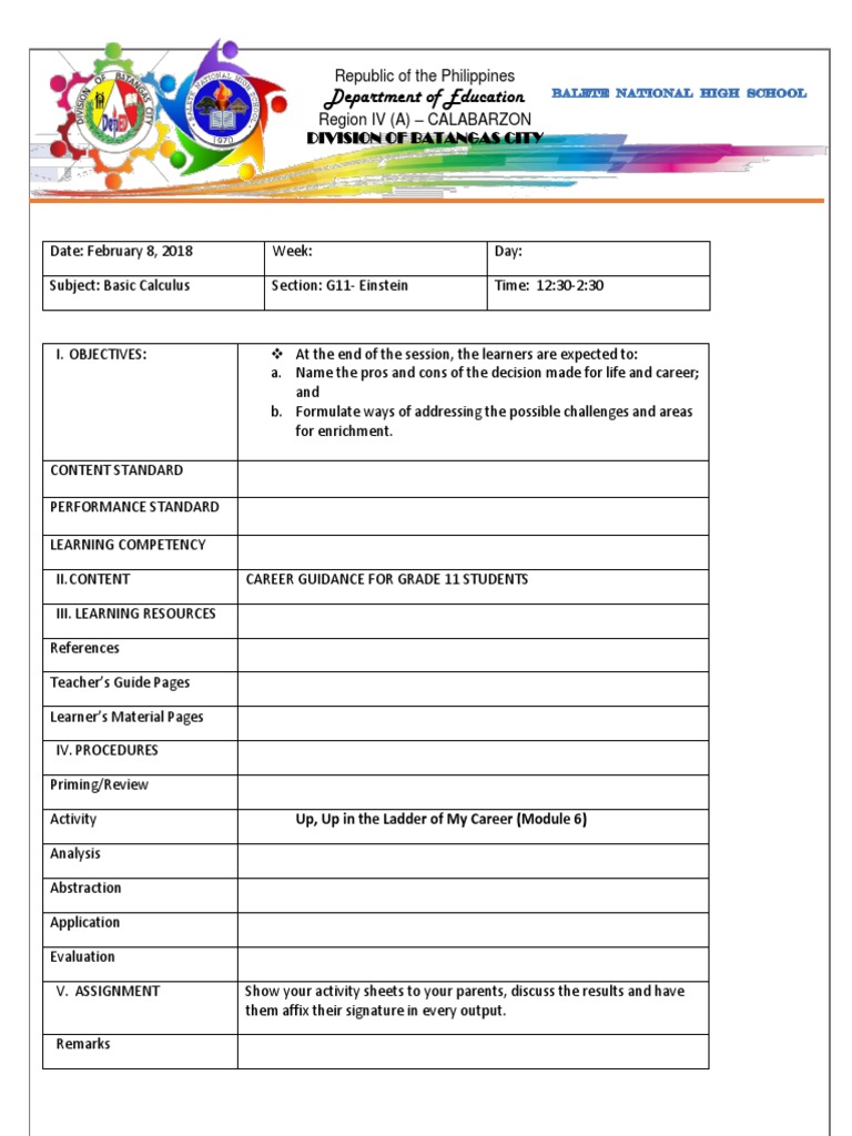 I. OBJECTIVES: At the end of the session, the learners are expected to: