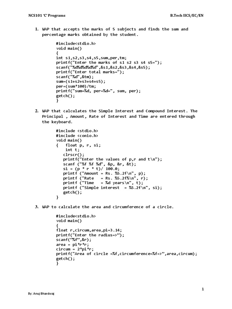 NCS101 ‘C’ Programs B.Tech IICS/EC/EN