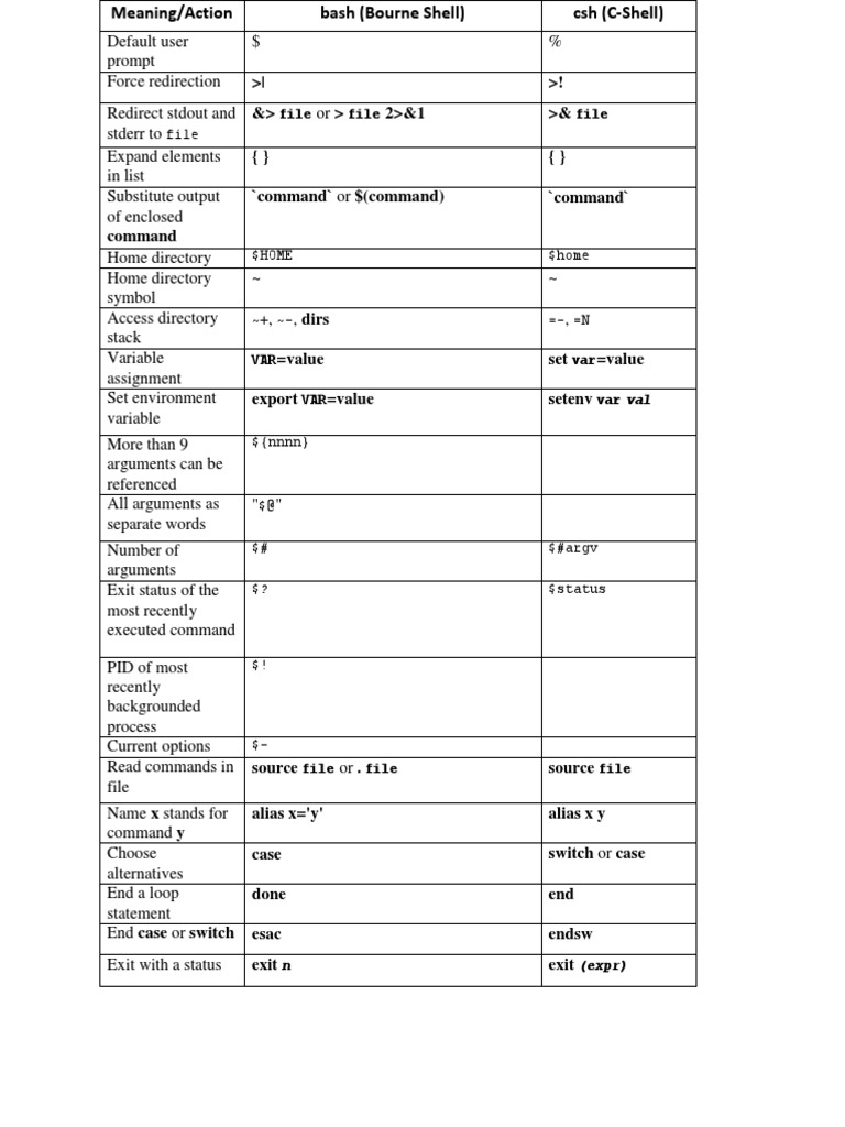 Meaning/Action bash (Bourne Shell) csh (C-Shell)