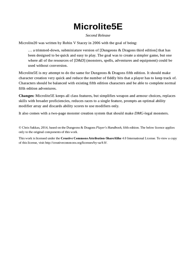 Changes: Microlite5E keeps all class features, but simplifies weapon and armour choices, replaces