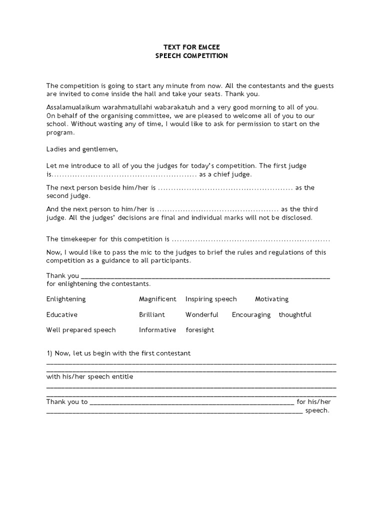 4) Next, please come to the stage contestant number four with his/her speech entitle