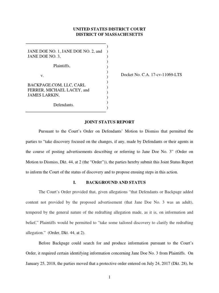 Re: Doe No. 1, et al. v. Backpage, LLC, et al., No. 11:17-cv-11069 (D. Mass.)