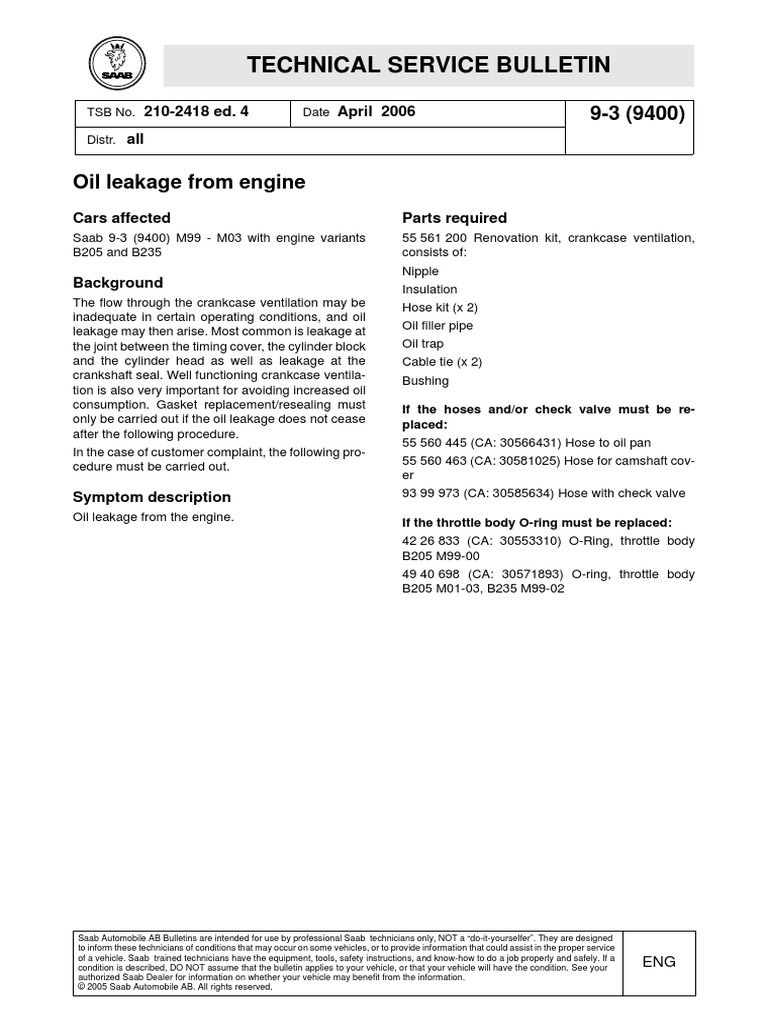 Saab Automobile AB Bulletins are intended for use by professional Saab technicians only, NOT a “do-it-yourselfer”. They are designed