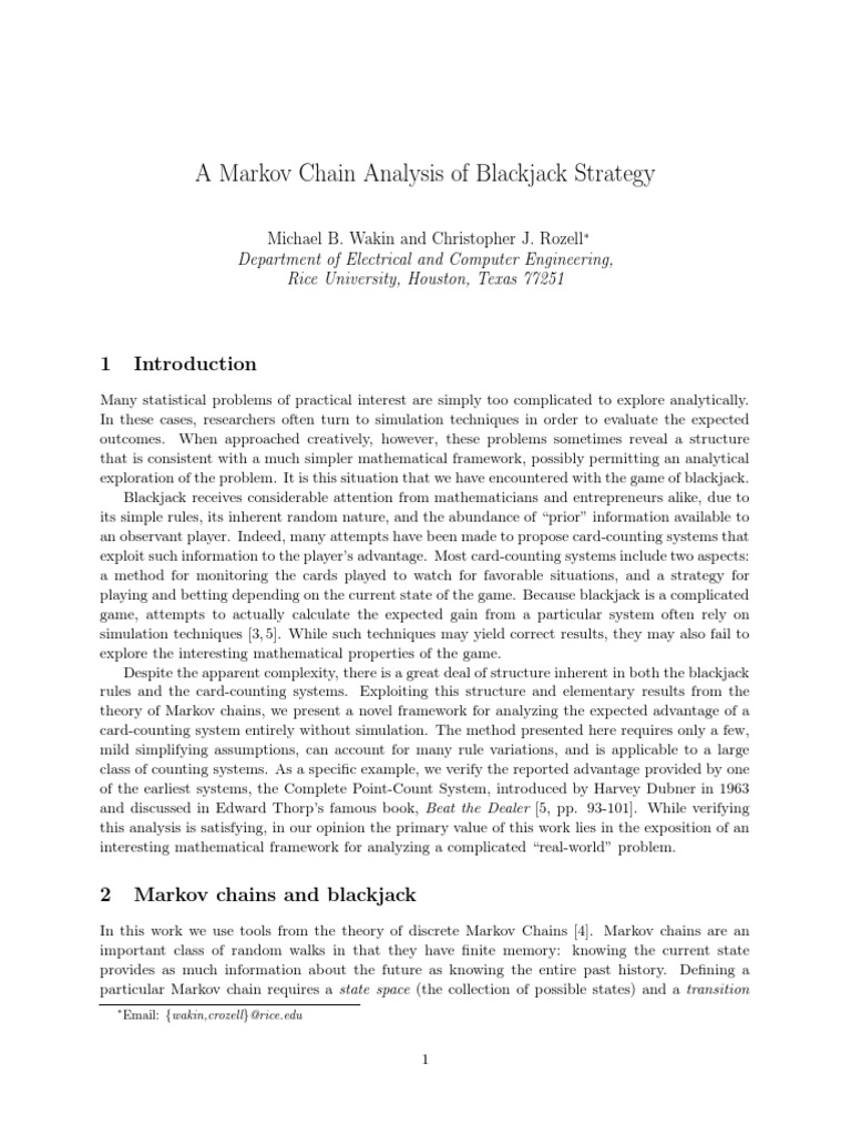 jack is only a casino game, our exercise illustrates the power of Markov chains in analyzing