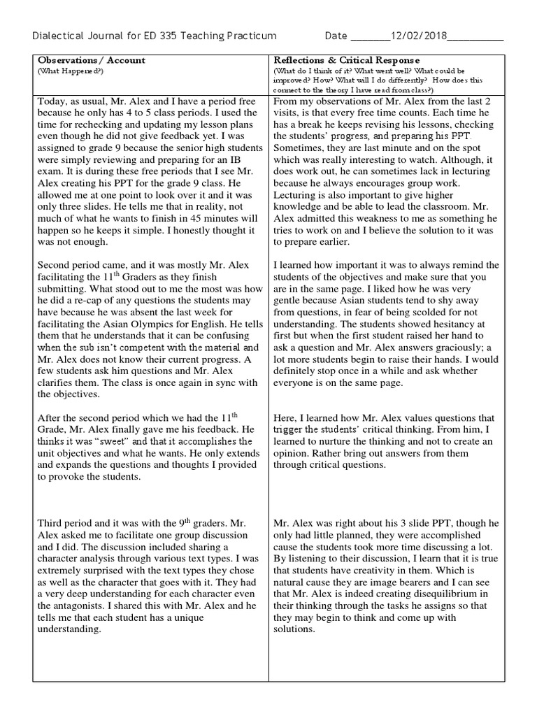 Dialectical Journal for ED 335 Teaching Practicum Date _______12/02/2018__________