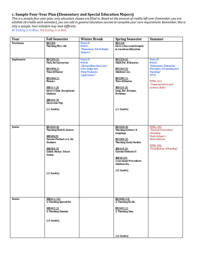 Sample Four-Year Plan (Elementary and Special Education Majors)