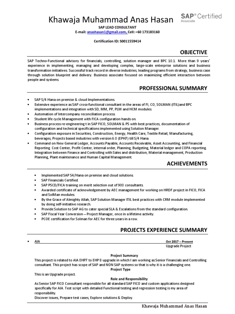 As SAP FICO/SOLMAN executive responsible for SAP FICO and SOLMAN with integration points with SD, MM,