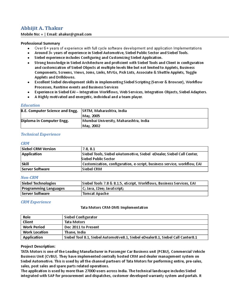 Around 3+ years of experience in Siebel Automotive, Siebel Public Sector and Siebel Tools.