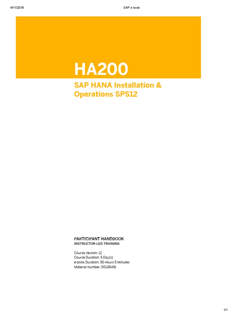 This document is a participant handbook for a 5-day instructor-led training course on installing and operating SAP HANA version SPS12. The handbook is an e-book estimated to take 55 hours and 5 minutes to complete and covers the key topics participants will need to know to successfully install and manage an SAP HANA database.