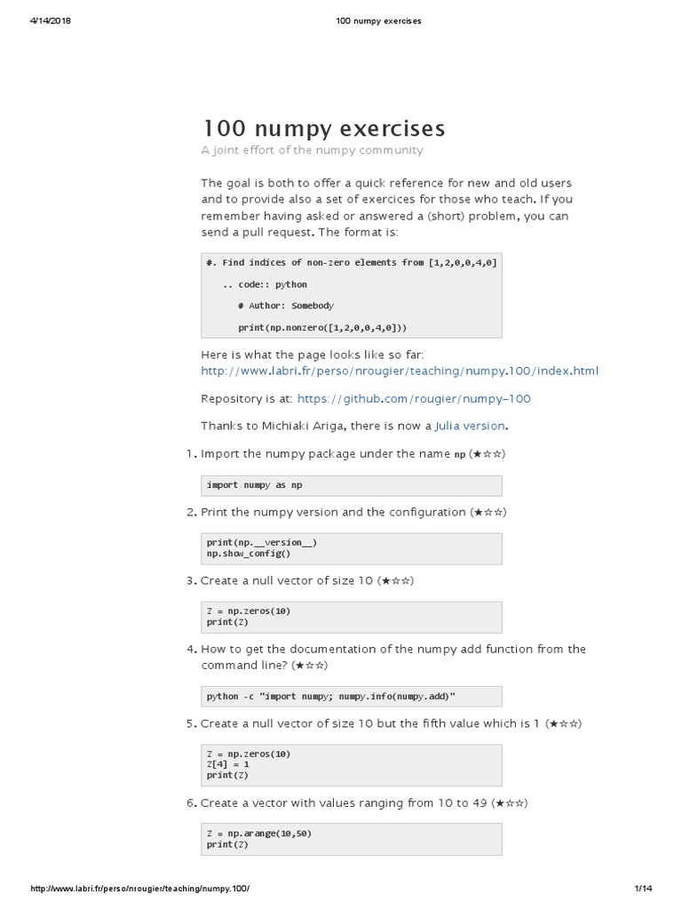 http://www.labri.fr/perso/nrougier/teaching/numpy.100/ 1/14