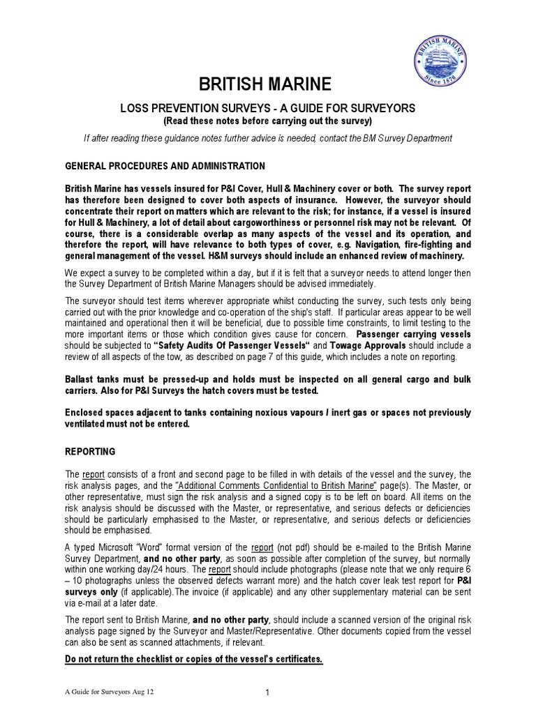 risk analysis pages, and the “Additional Comments Confidential to British Marine” page(s). The Master, or