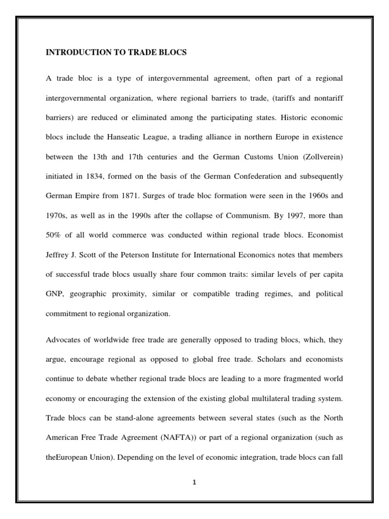 of trading blocs such as Free Trade Area, Customs union, Economic Union, custom