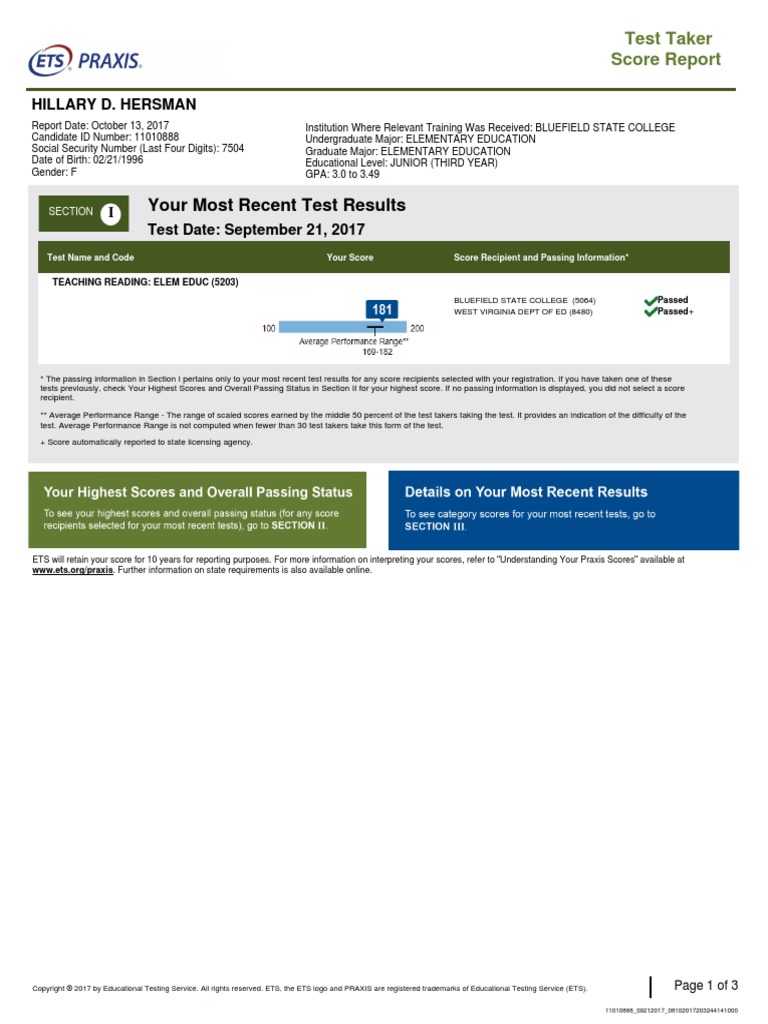 TEACHING READING: ELEM EDUC (5203) 181 Required minimum score is blank, Qualifying score is 162 Score reported status is and Overall status is YES Passed Test date is , September 21, 2017