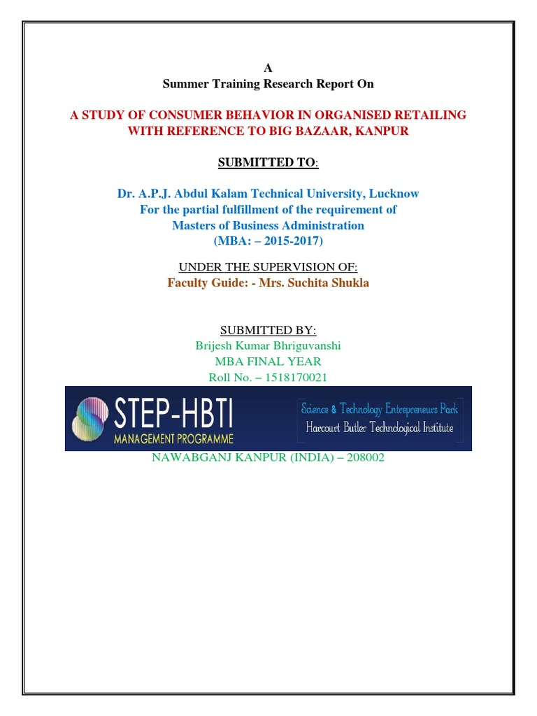 reference to Big Bazaar” in the year 2015-2017 in final fulfillment of Masters of Business