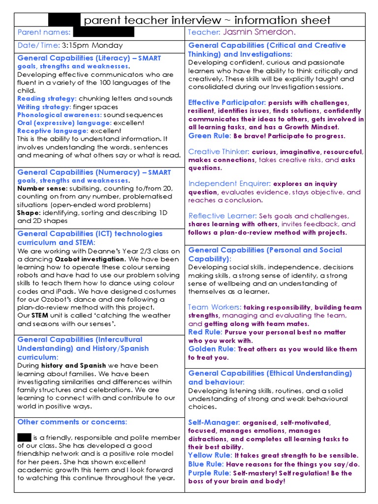 Parent names: blah and blah Teacher: Jasmin Smerdon.