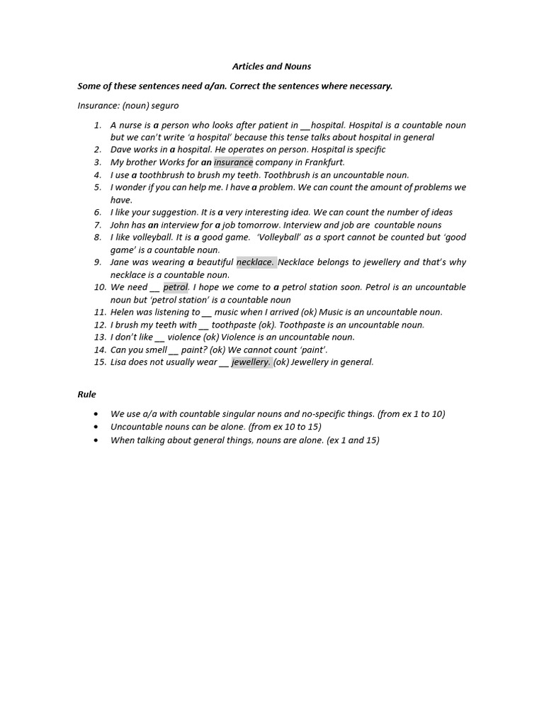 Uncountable nouns can be alone. (from ex 10 to 15)
