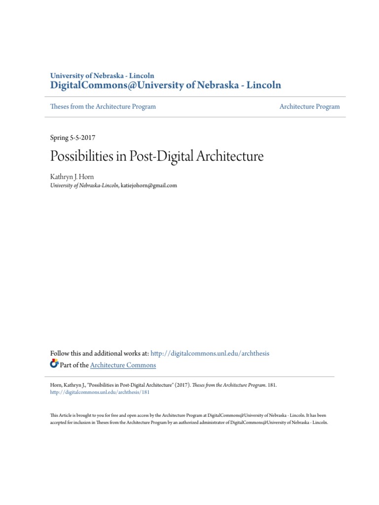 Horn, Kathryn J., "Possibilities in Post-Digital Architecture" (2017). Theses from the Architecture Program. 181.