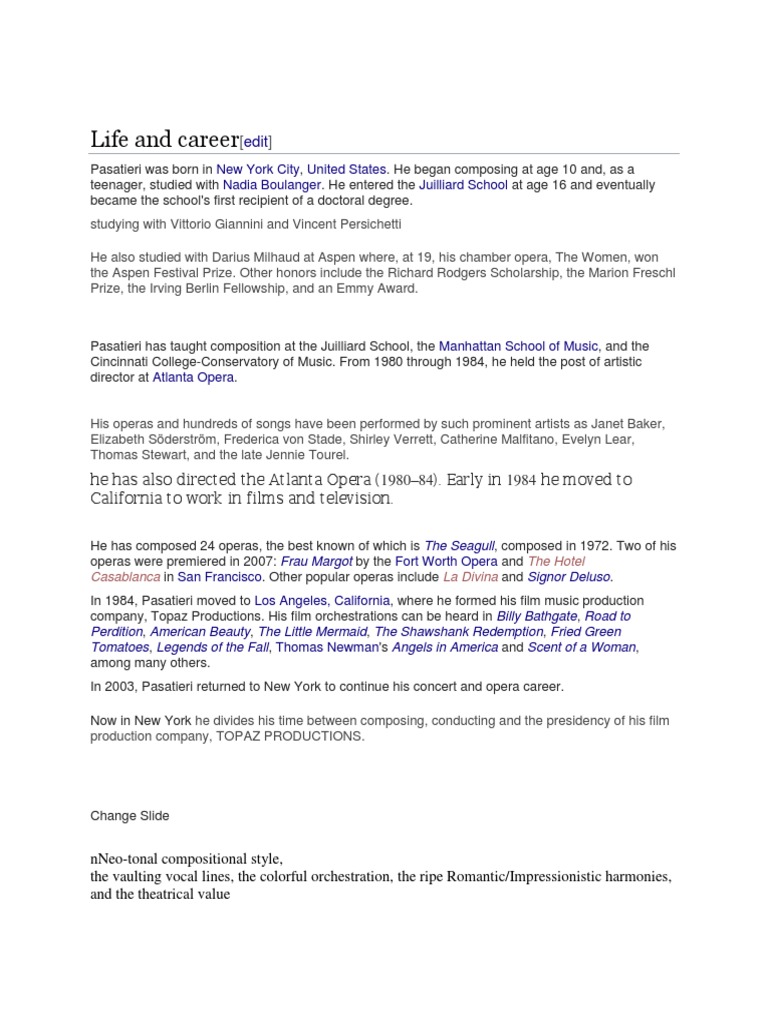 Pasatieri has taught composition at the Juilliard School, the Manhattan School of Music, and the