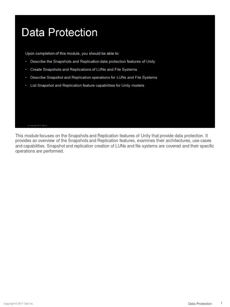 This module focuses on the Snapshots and Replication features of Unity that provide data protection.