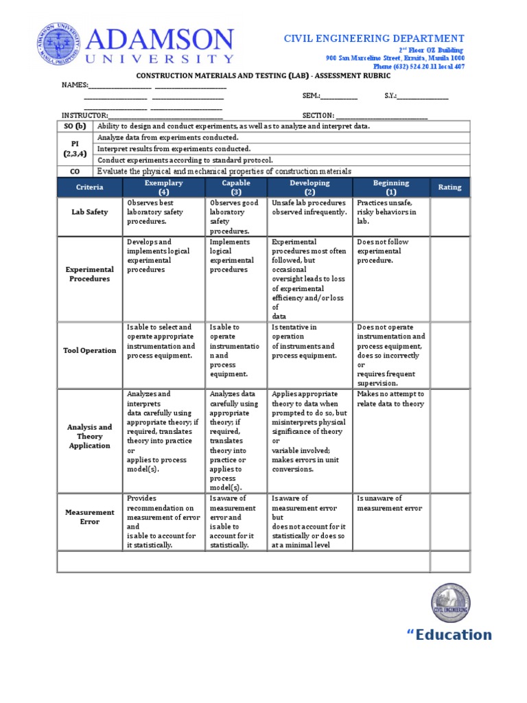 CONSTRUCTION MATERIALS AND TESTING (LAB) - ASSESSMENT RUBRIC