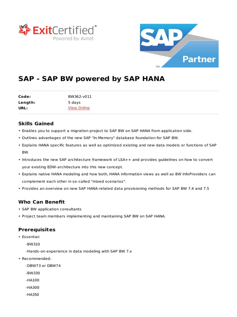 • Project team members implementing and maintaining SAP BW on SAP HANA.