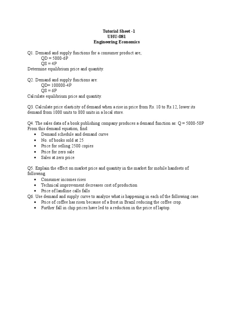 Q1. Calculate the elasticity of demand for the demand curve: P= 100-5Q at each of the following