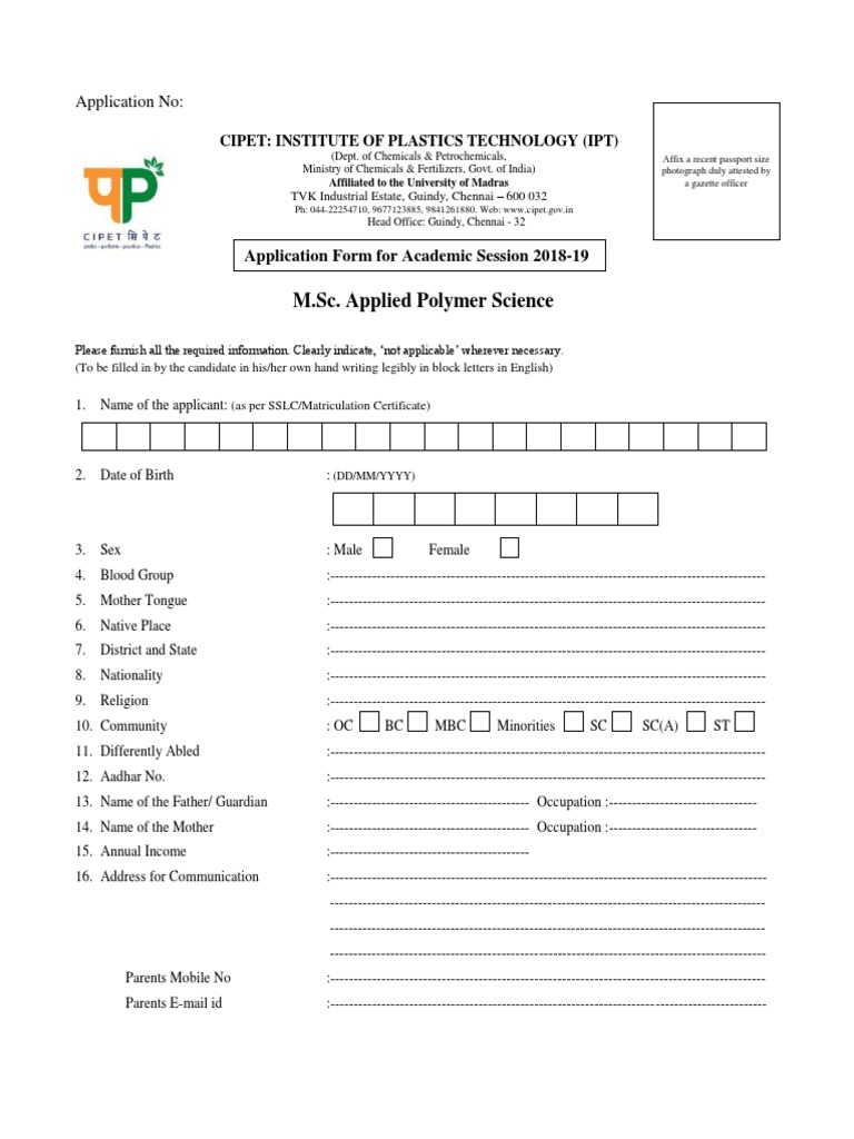 5. The dully filled in application should be sent to the Principal Director & Head, CIPET, Chennai – 600 032 on