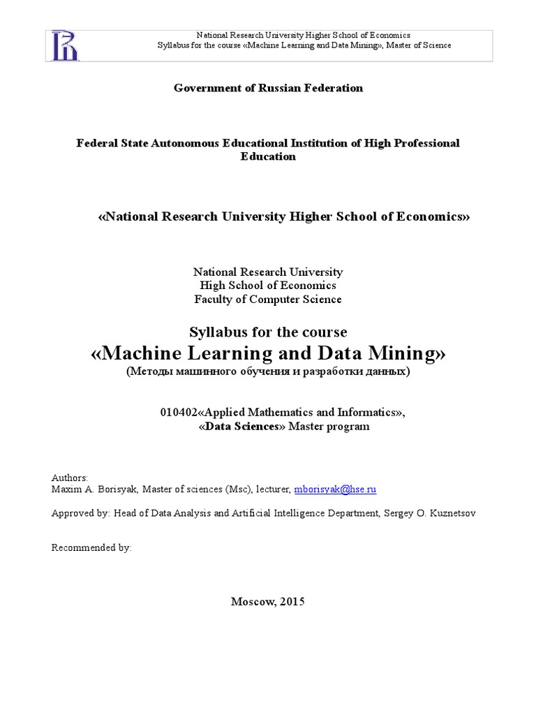 Syllabus for the course «Machine Learning and Data Mining», Master of Science