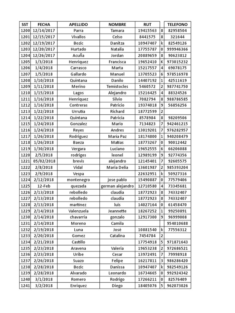 SST FECHA APELLIDO NOMBRE RUT TELEFONO