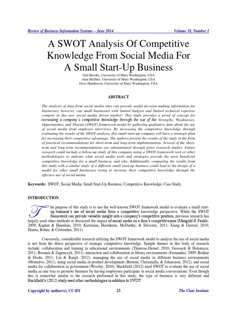 Keywords: SWOT; Social Media; Small Start-Up Business; Competitive Knowledge; Case Study